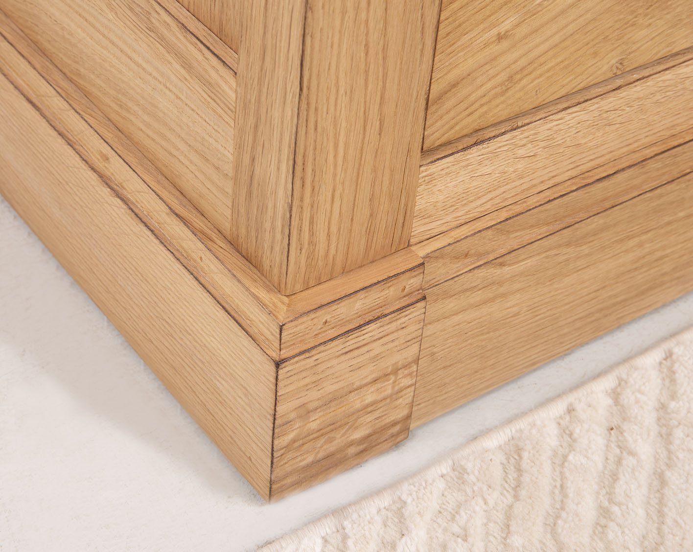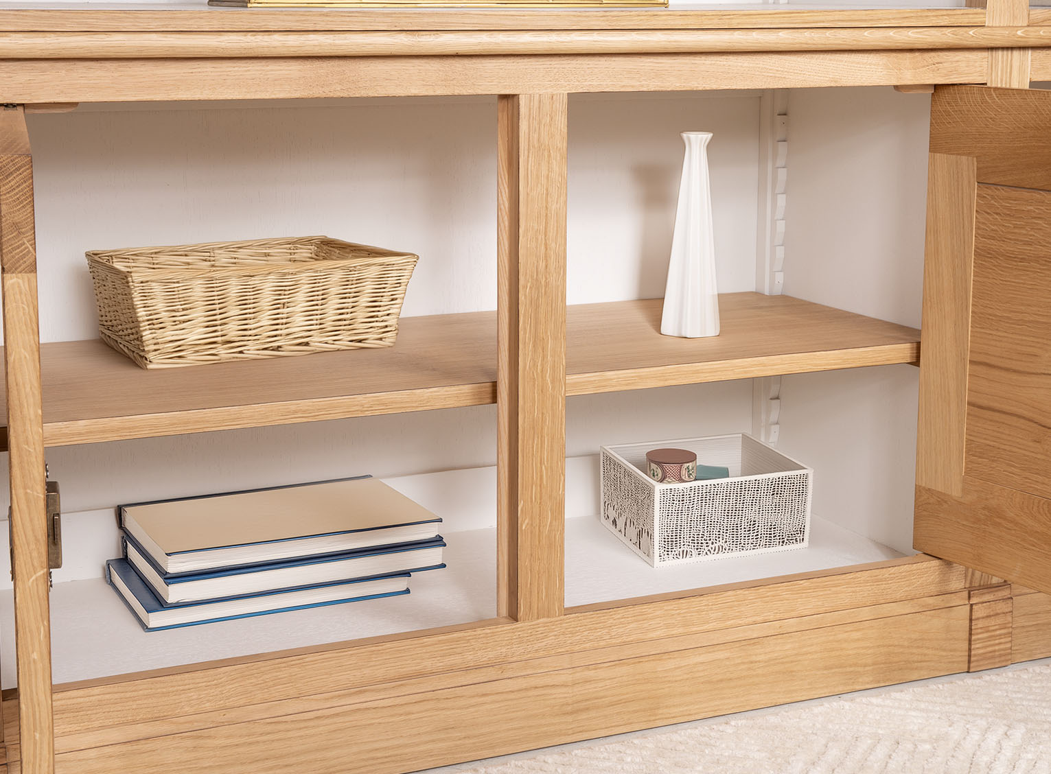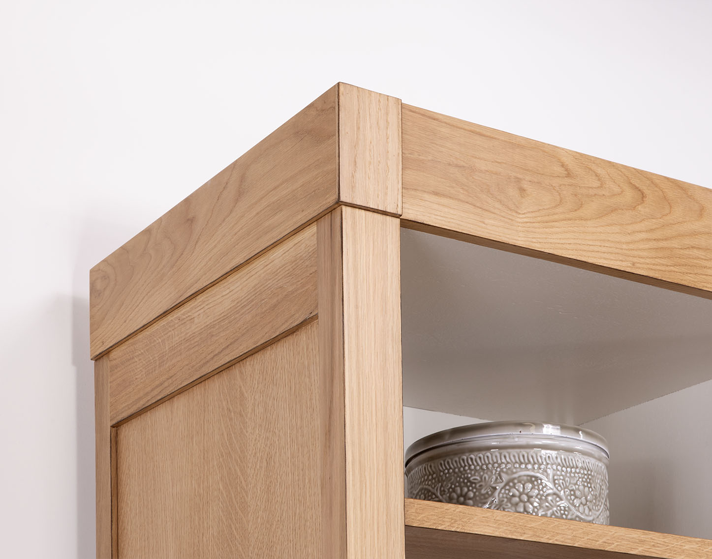 Sa finition est un chêne Naturel légèrement patiné pour l’extérieur, ivoire pour l’intérieur.