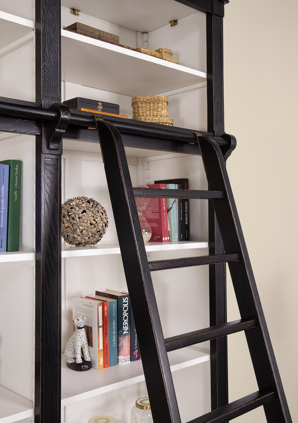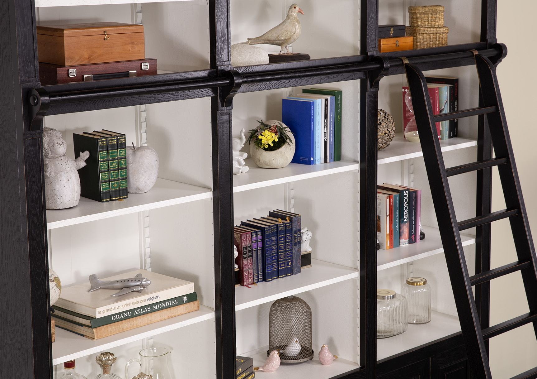 Echelle en chêne massif, fixée avec des crochets (en fer) sur supports chêne massif. Les fonds et les étagères sont en Frêne Massif.