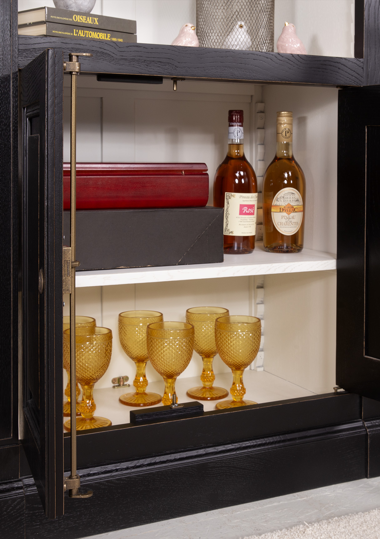 Sa finition est un chêne brossé noir patiné pour l’extérieur, Ivoire n°2 légèrement patiné pour l’intérieur.