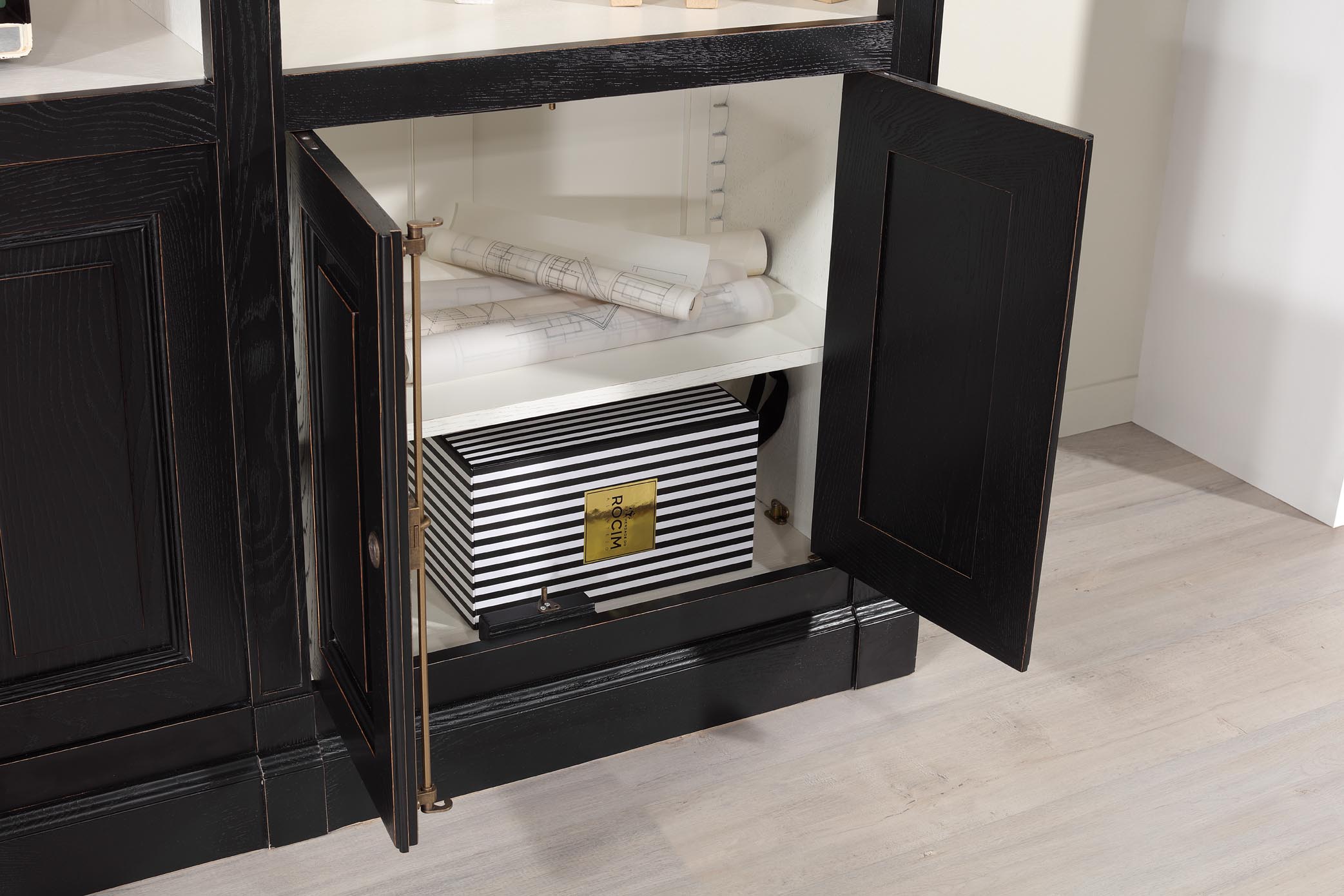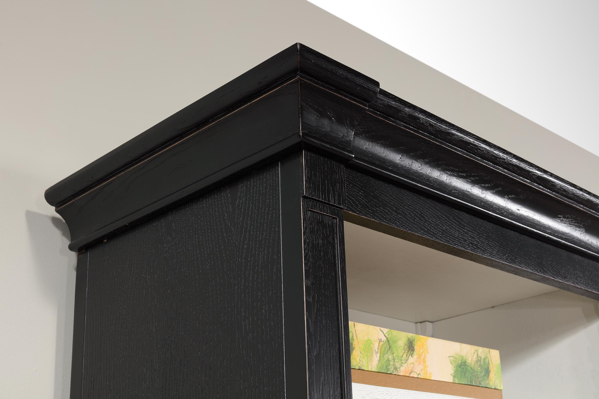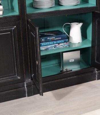 Sa finition est un chêne brossé noir patiné pour l’extérieur, Ivoire n°2 légèrement patiné pour l’intérieur.