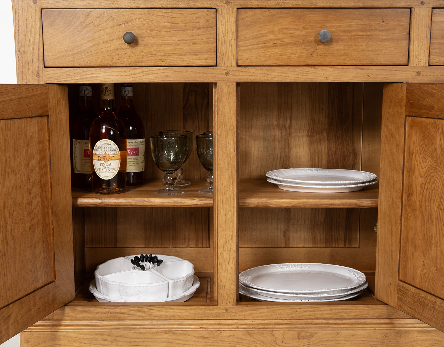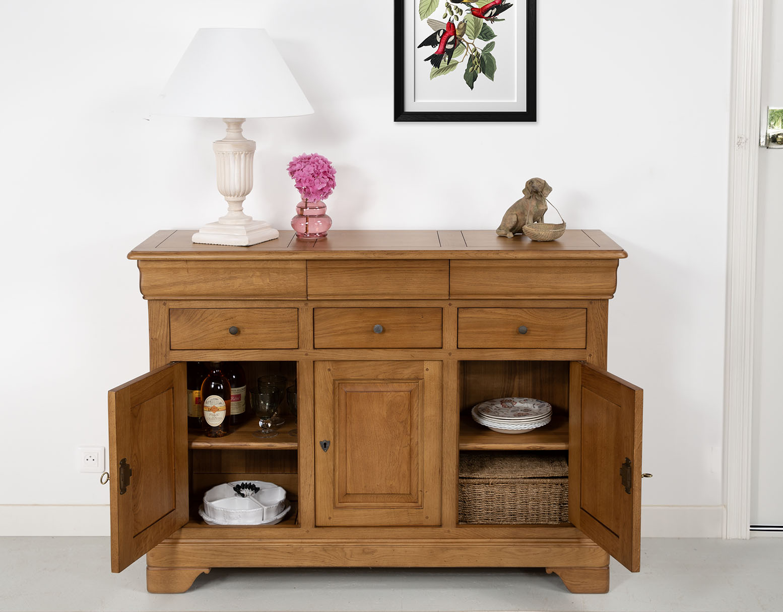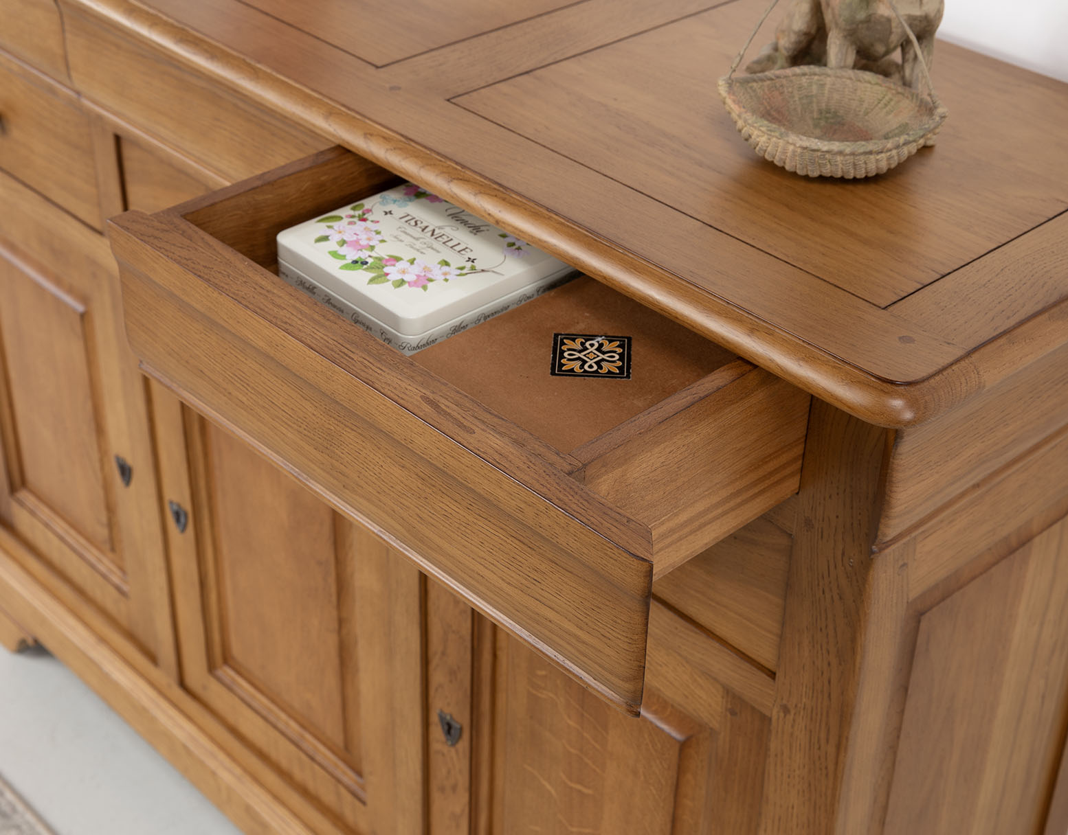 Petit buffet 3 portes 6 tiroirs réalisé en chêne massif de style Louis Philippe.