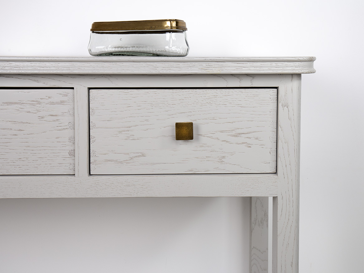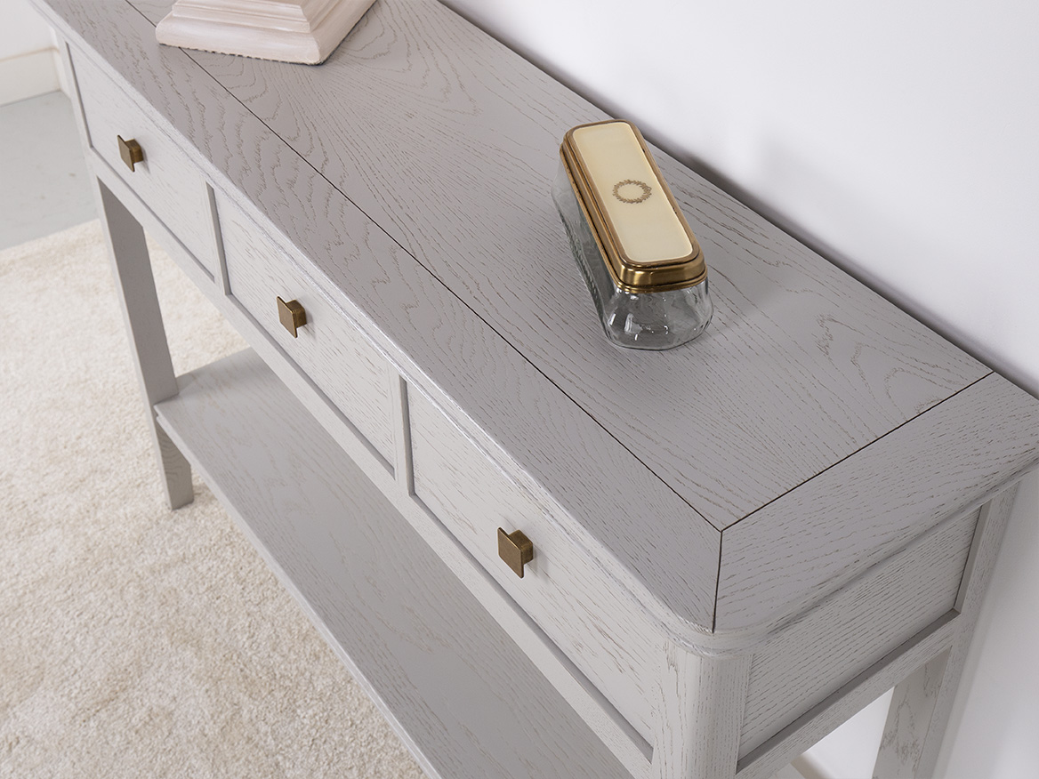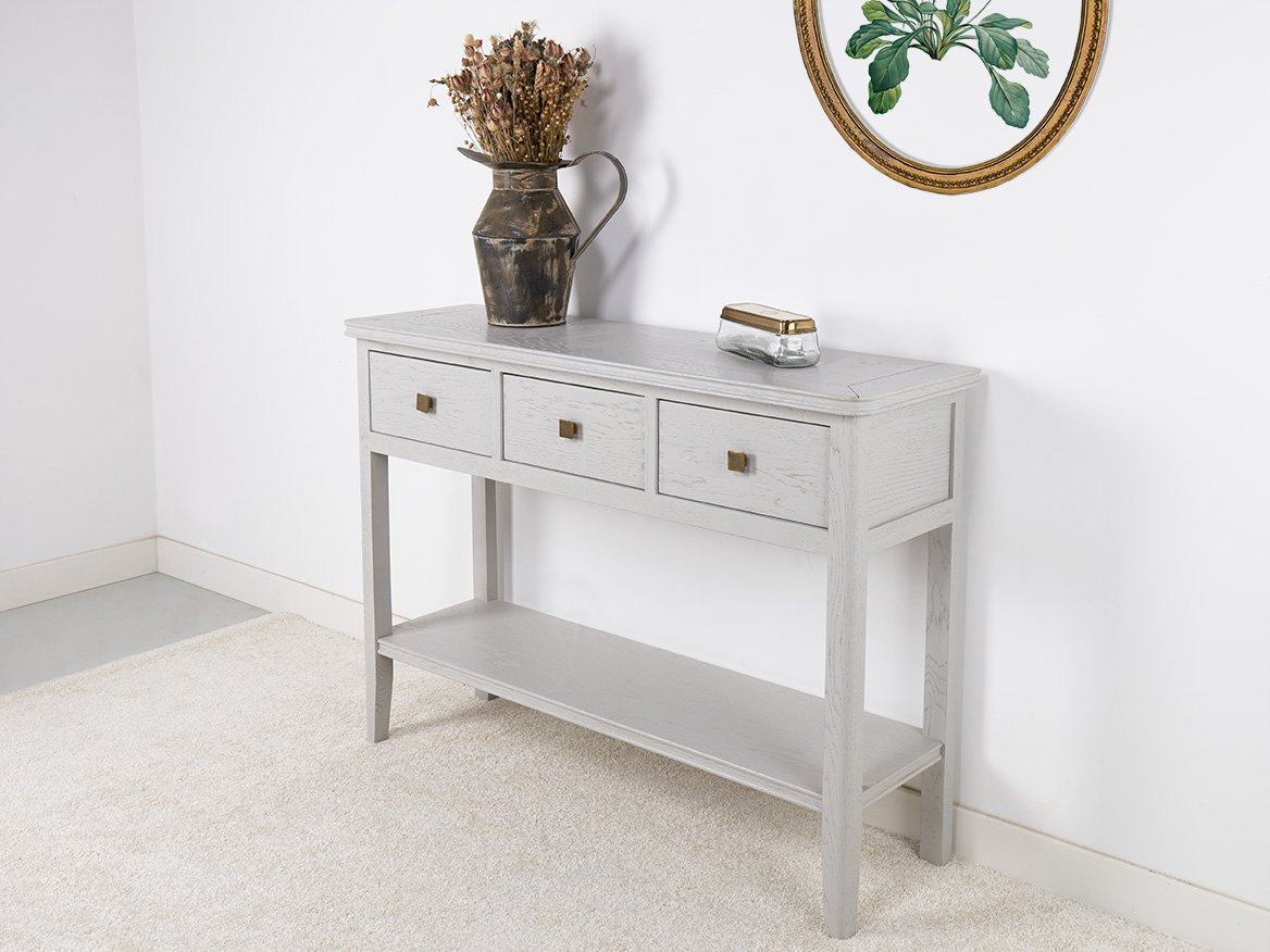 Console 3 tiroirs Evan réalisée en chêne de style Contemporain Finition Chêne Brossé Gris Perle SEULEMENT 1 DISPONIBLE