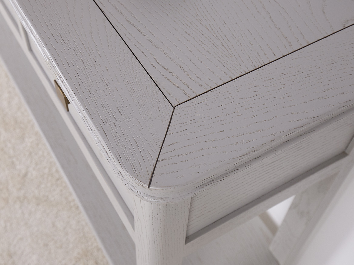Sa finition est un Chêne Brossé Gris Perle légèrement patiné.