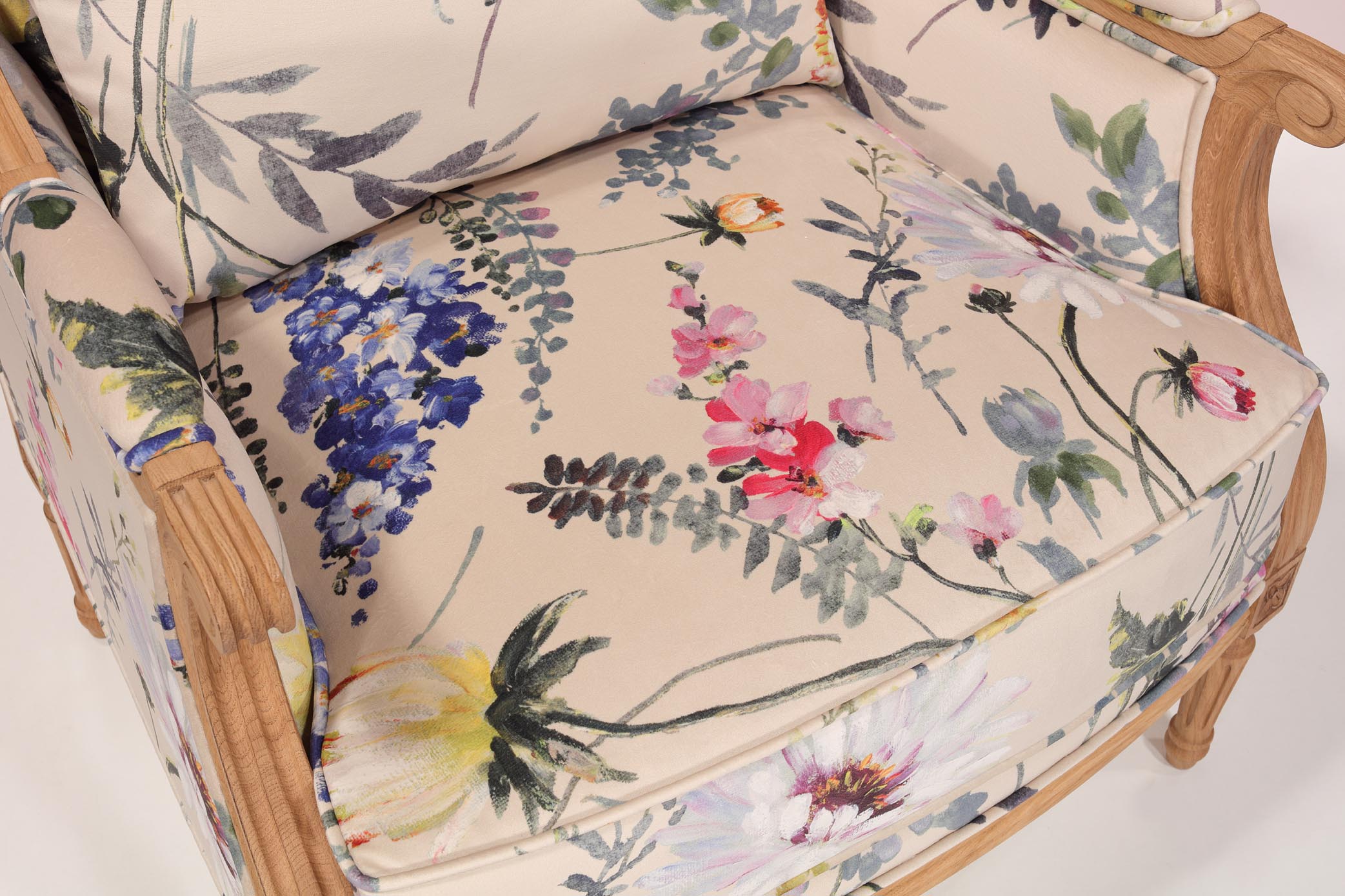 Fauteuil recouvert d’un tissu d’ameublement, et d’un coussin recouvert d’un tissu d’ameublement, Collection FSM Grayish Orange