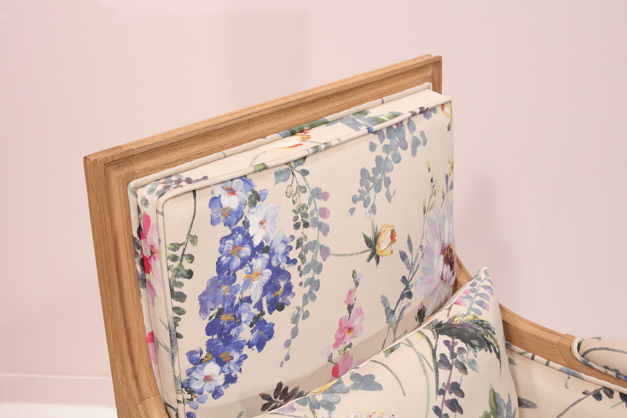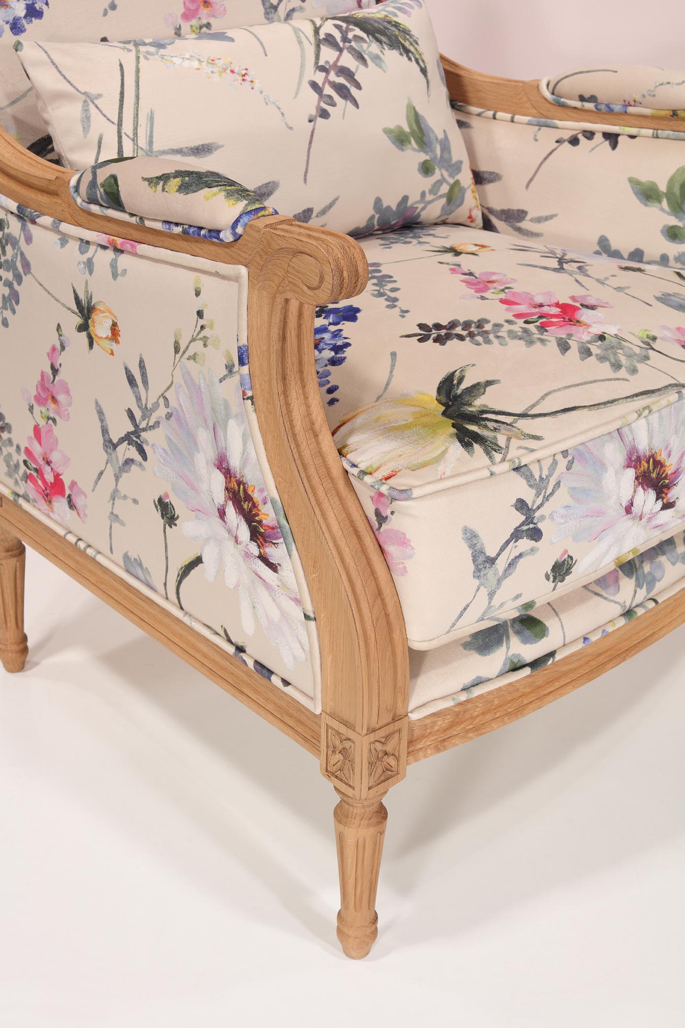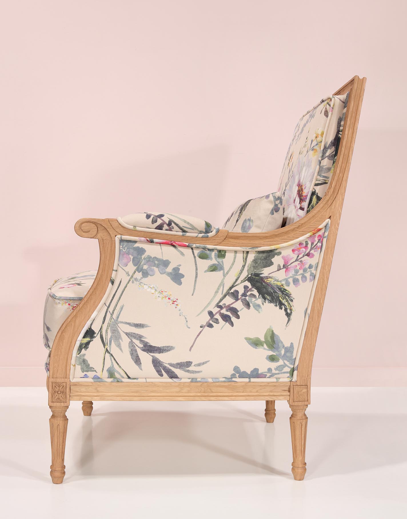 Structure en chêne massif assemblé par tenons et mortaises. Suspension sangles élastiques et mousse HR. Dossier et accoudoirs mousse HR