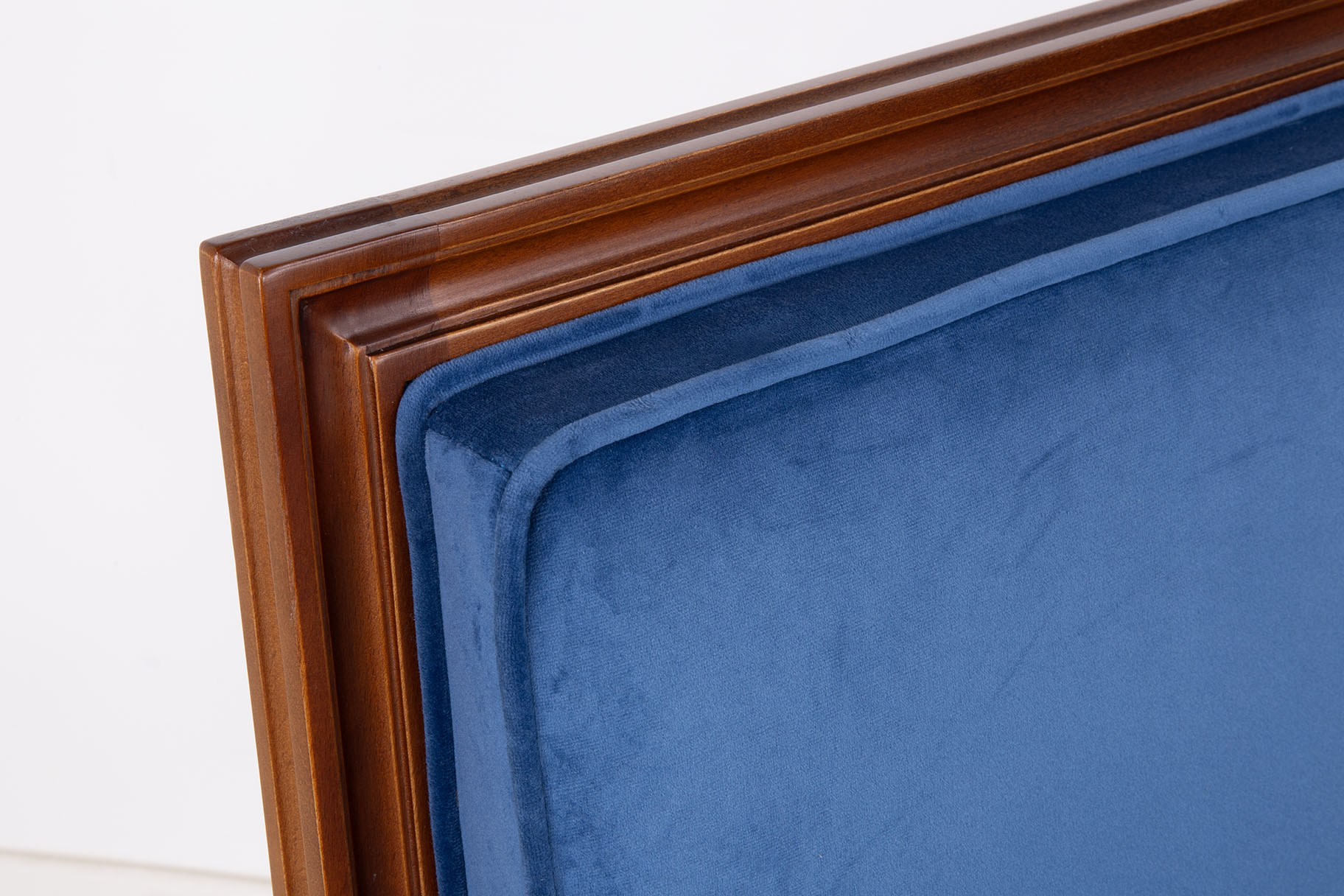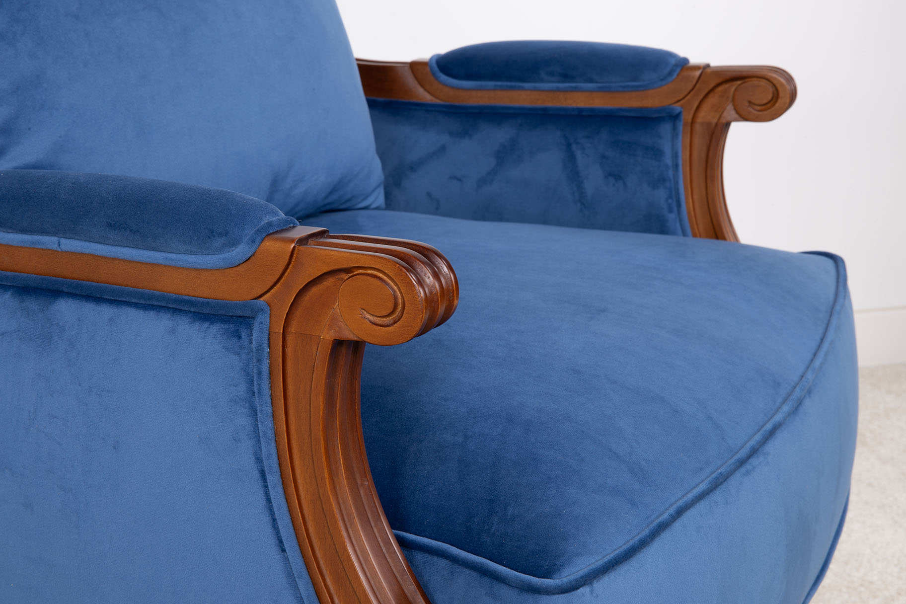 Garnissage semi-traditionnel sur sangles élastiques et profilés agglomérés. Dossier et assise garnis mousse haute résilience 36kg/m2