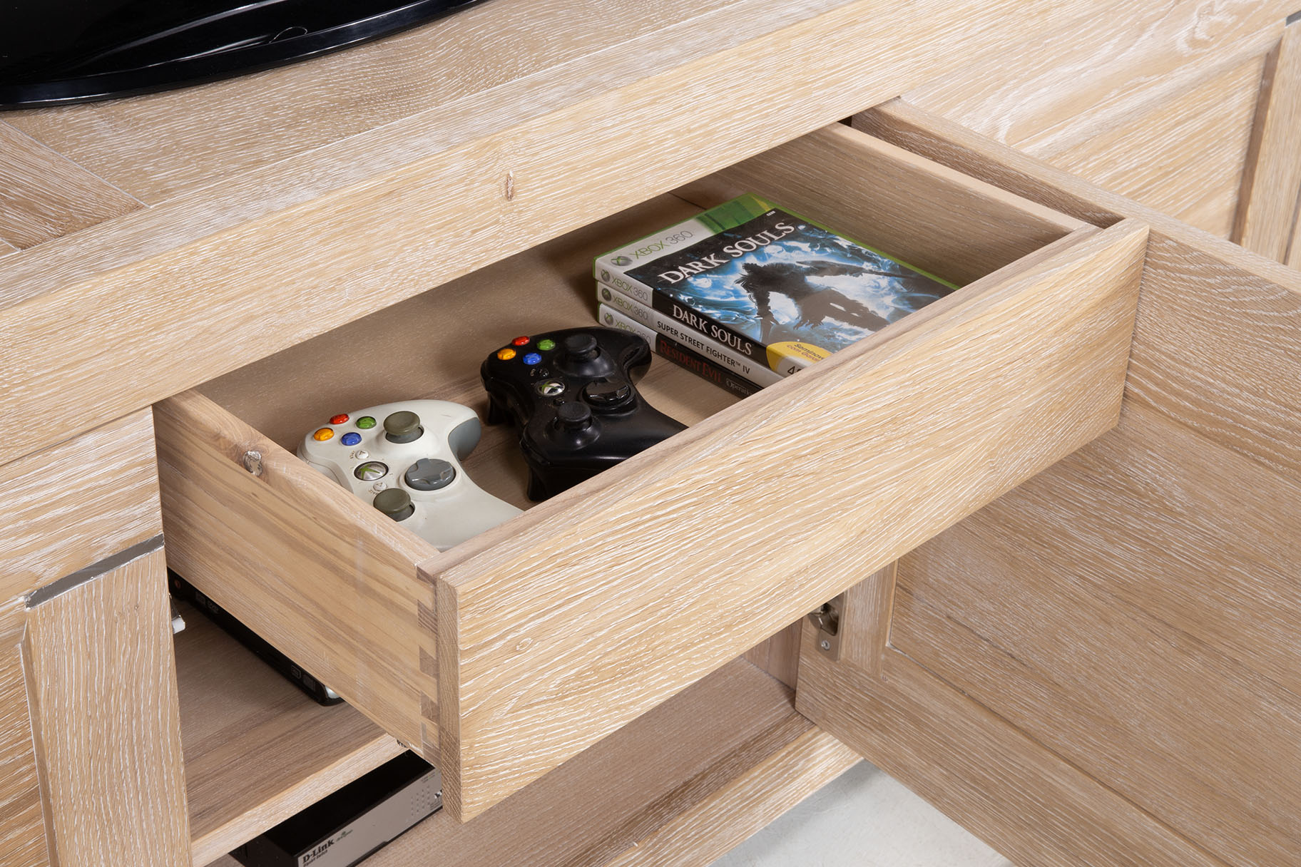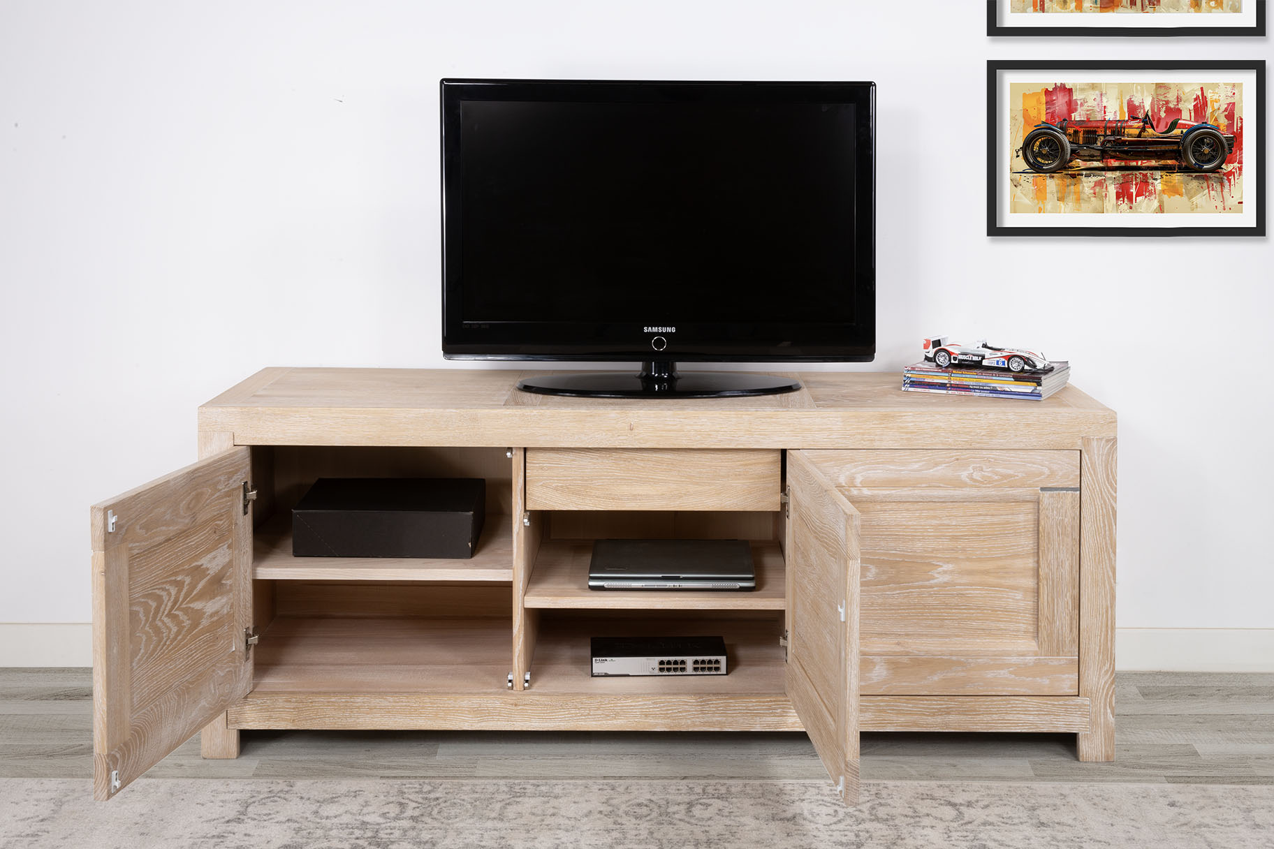 Ce meuble Tv ce fait aussi avec d’autre finition. La finition chêne Brossé Blanchi apportera à votre intérieur de la luminosité, tout en gardant la prestance et l’élégance du chêne.