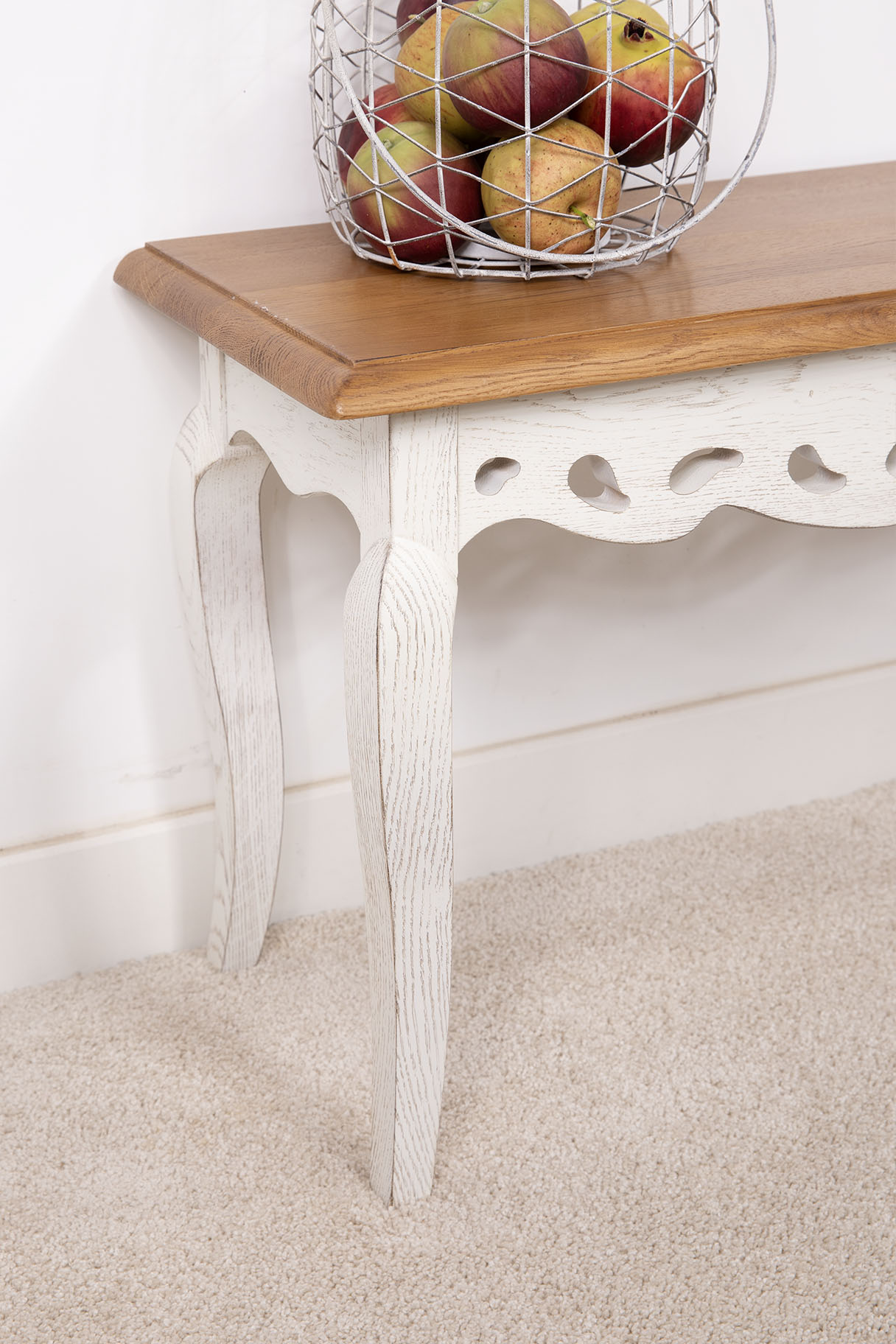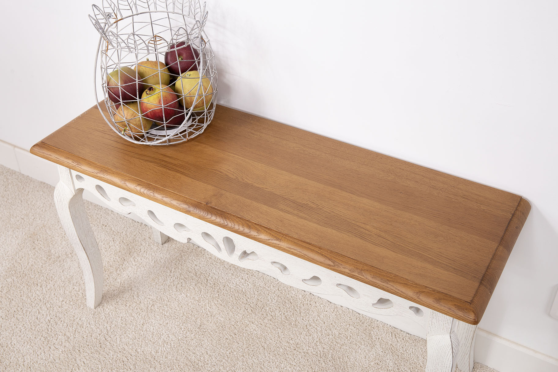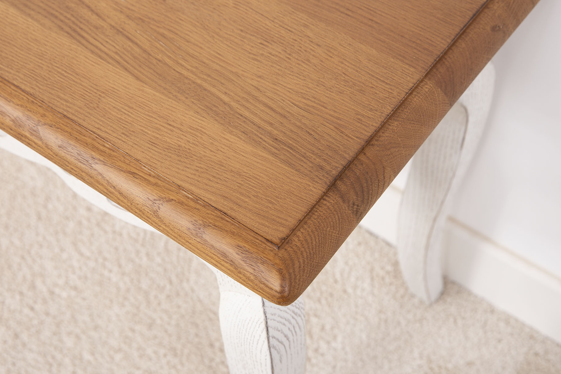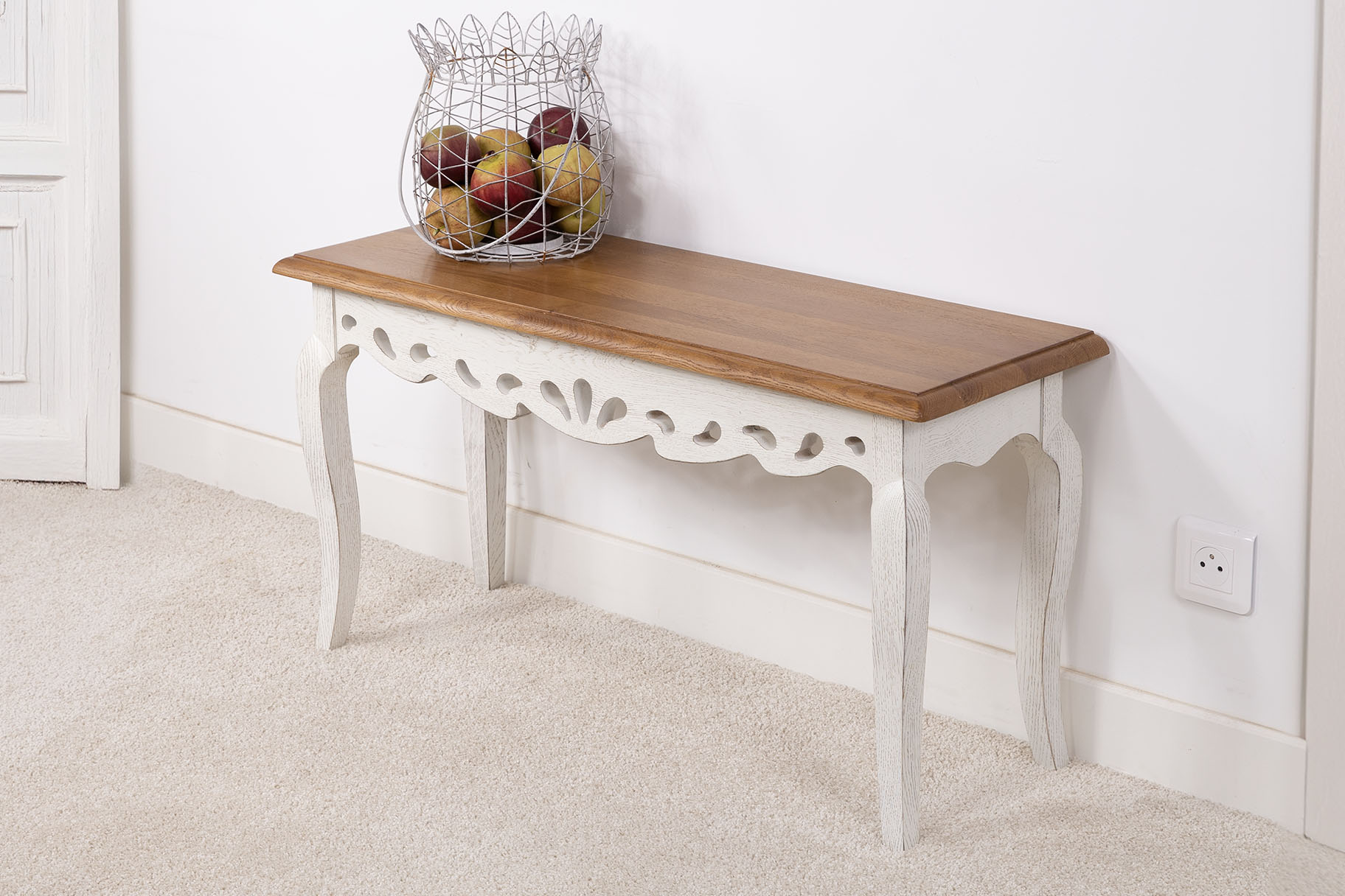 Finition chêne Doré ciré et lustré pour le plateau, le corps et un Brossé Ivoire patiné.
