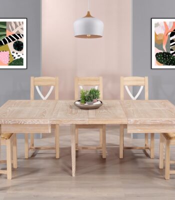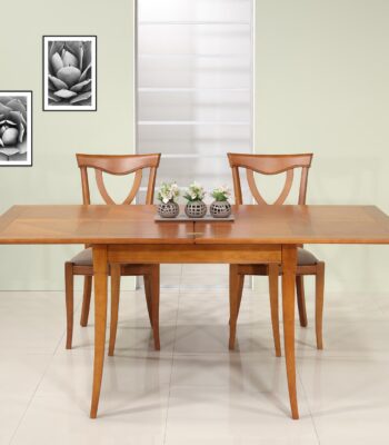 130×130 avec 1 allonge incorporée sous le plateau, avec son allonge cette table mesure 180×130.
