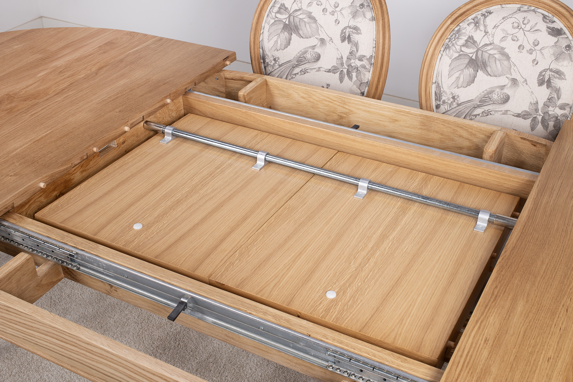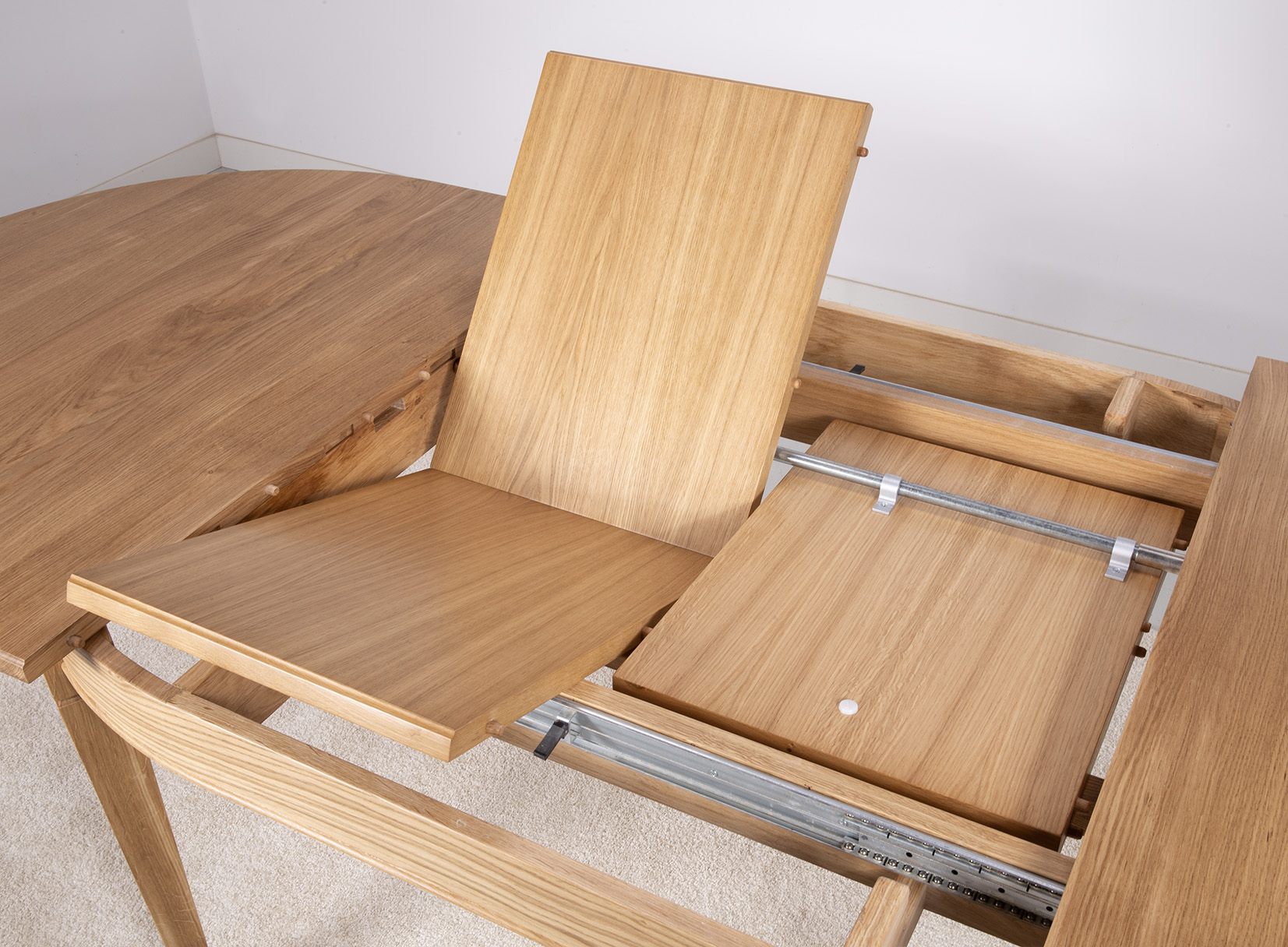 L’ouverture de la table est synchronisée grâce à ses coulisses métalliques,