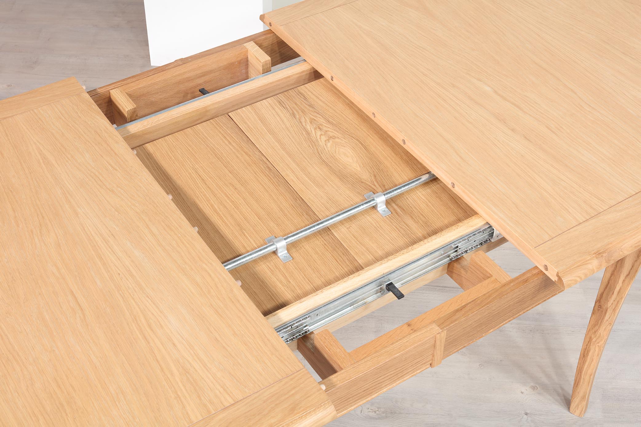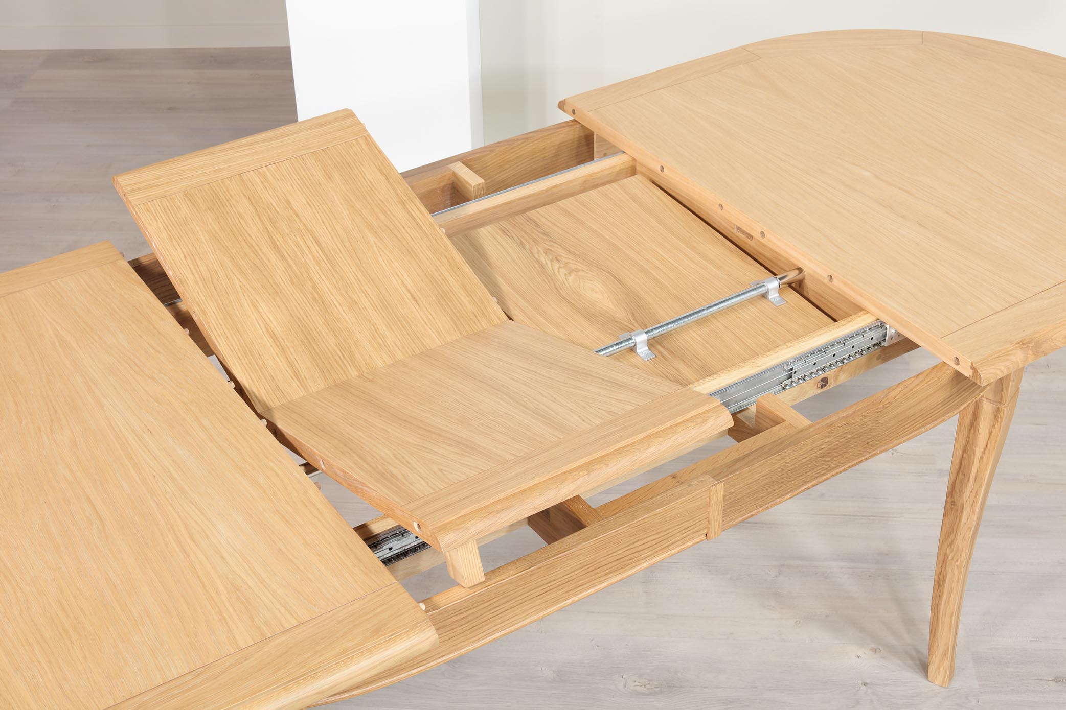 L’ouverture de la table est synchronisée grâce à ses coulisses métalliques,