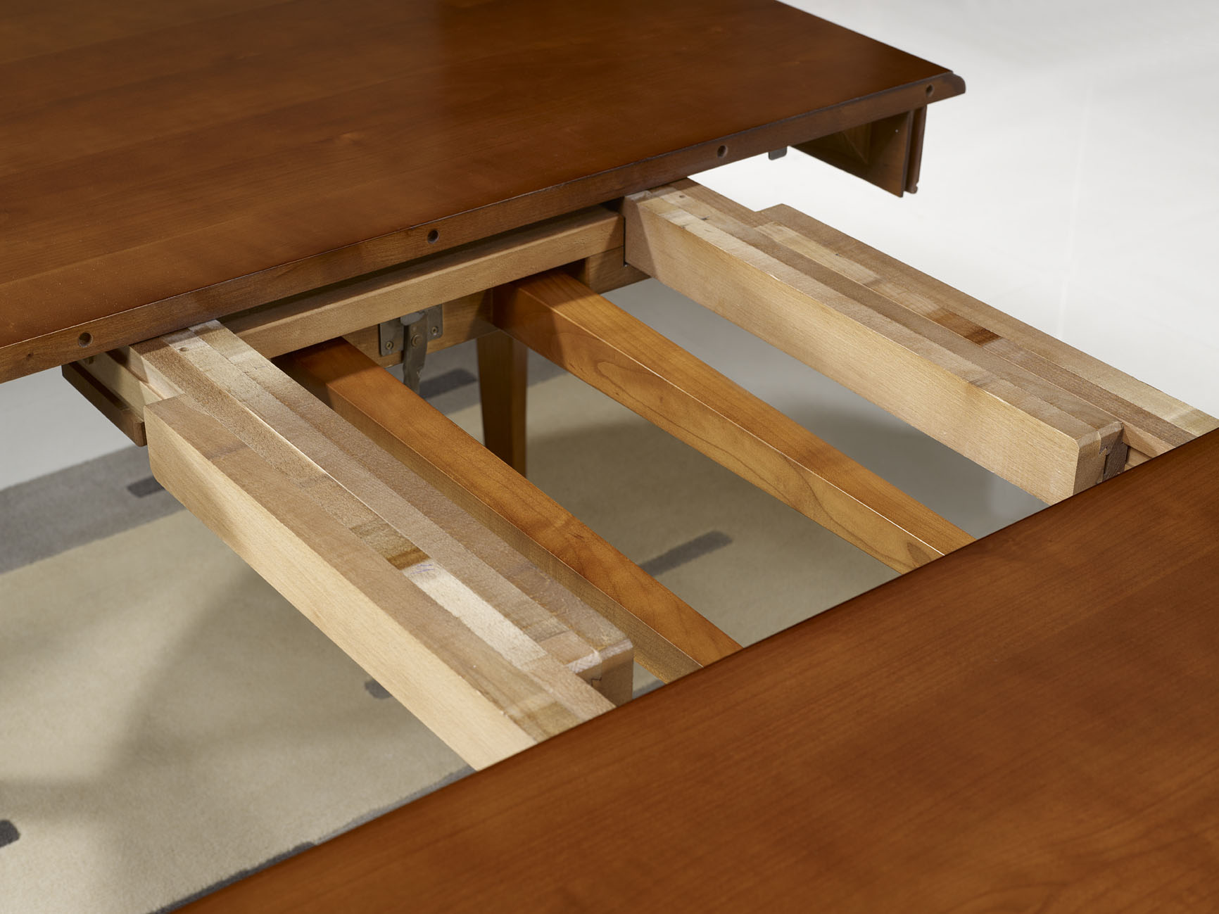 Dessous la table, 2 pieds de renforts rabattables, afin de soutenir les allonges.